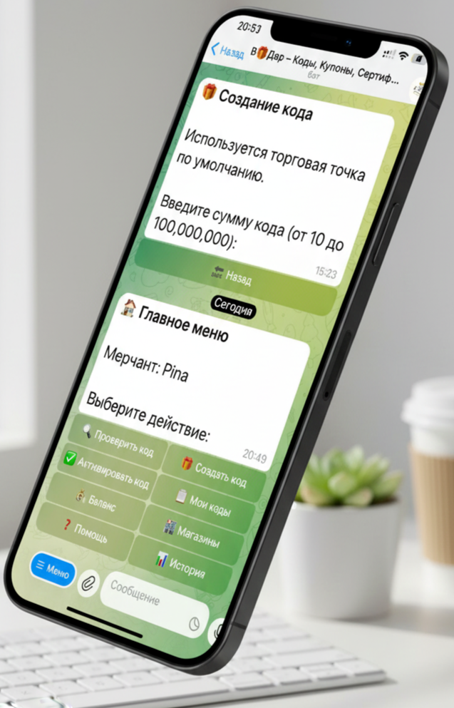 Пользователи активируют коды через удобный Telegram-бот и управляют своим балансом.